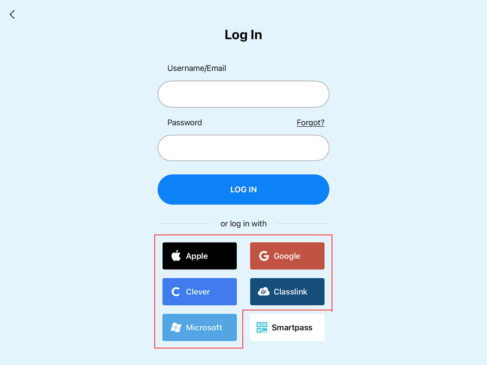 If the student account uses Apple, Google, Clever, or Microsoft, use one of the corresponding buttons below.