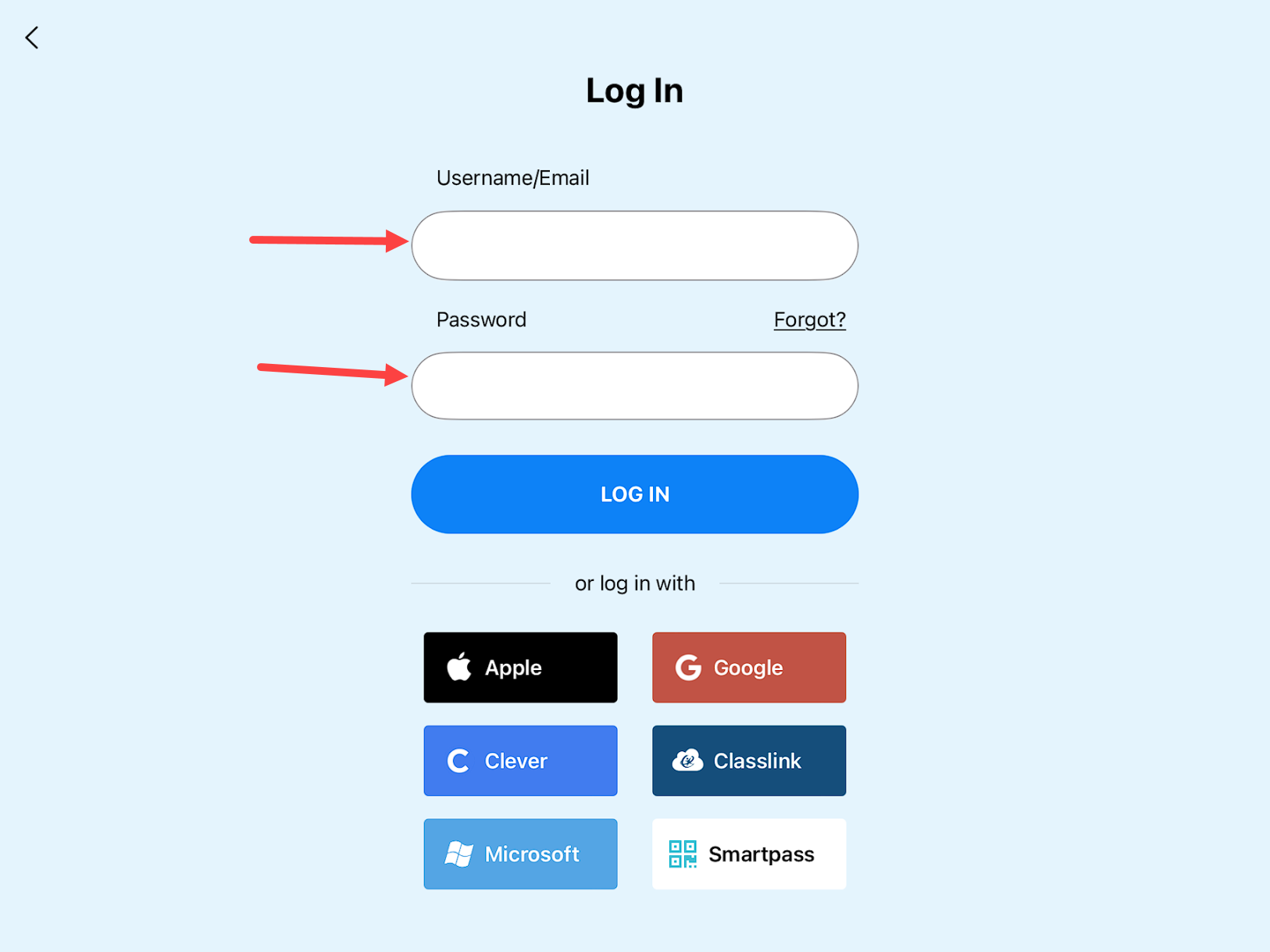 If the account uses a Tynker username/email login, use the Username/Email and Password input fields to log in.