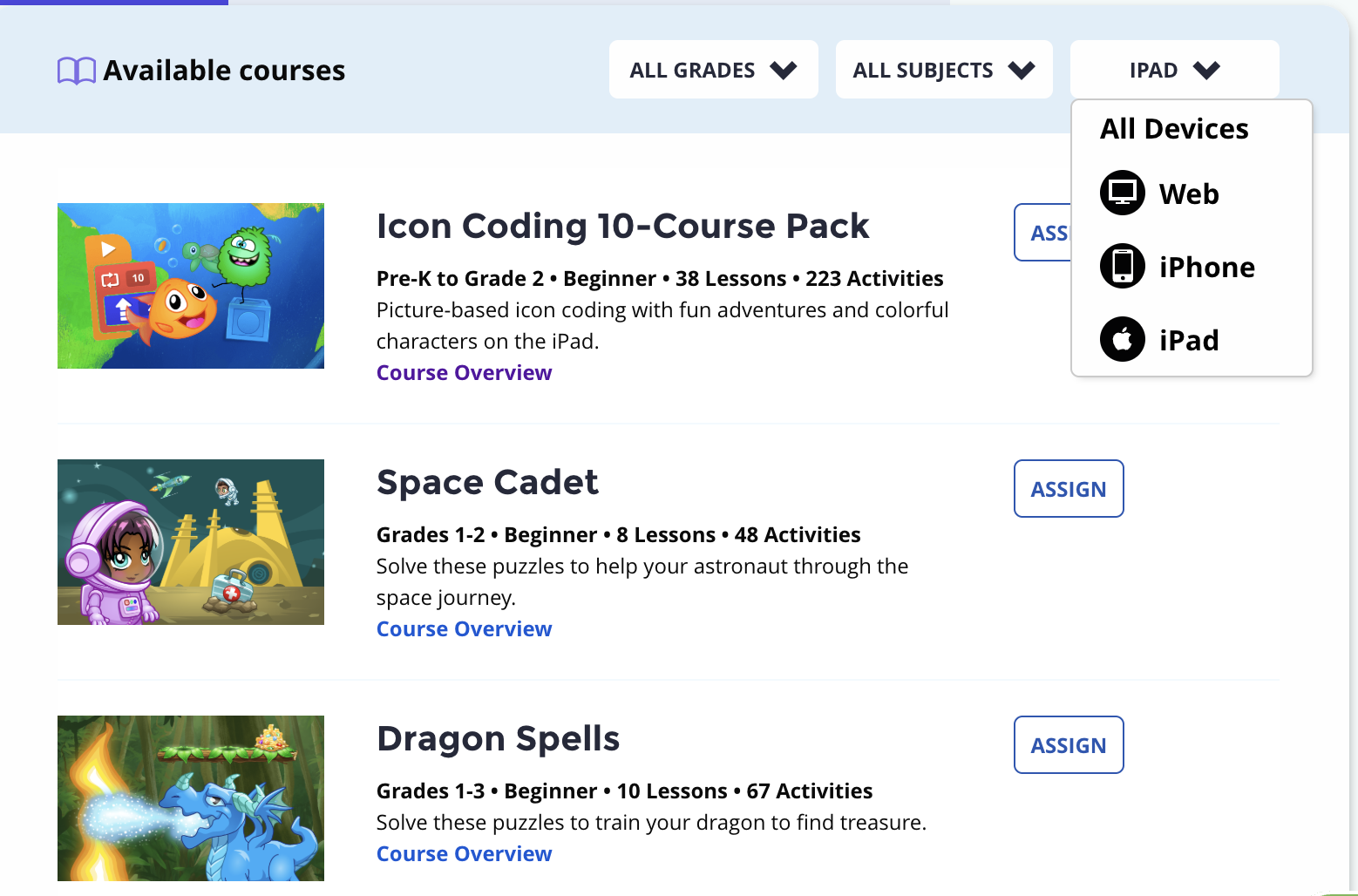 How do you assign courses for students to use on iPad?