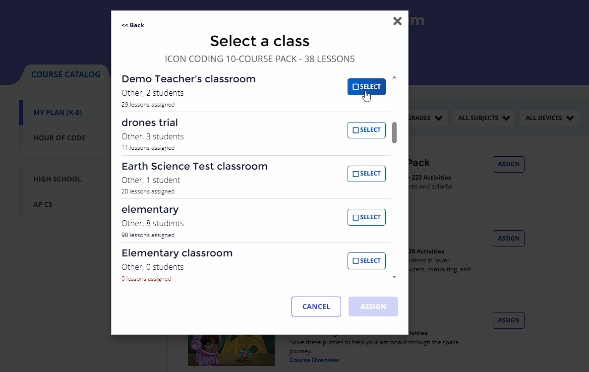 Pick the class or classes you want to assign the lessons to.