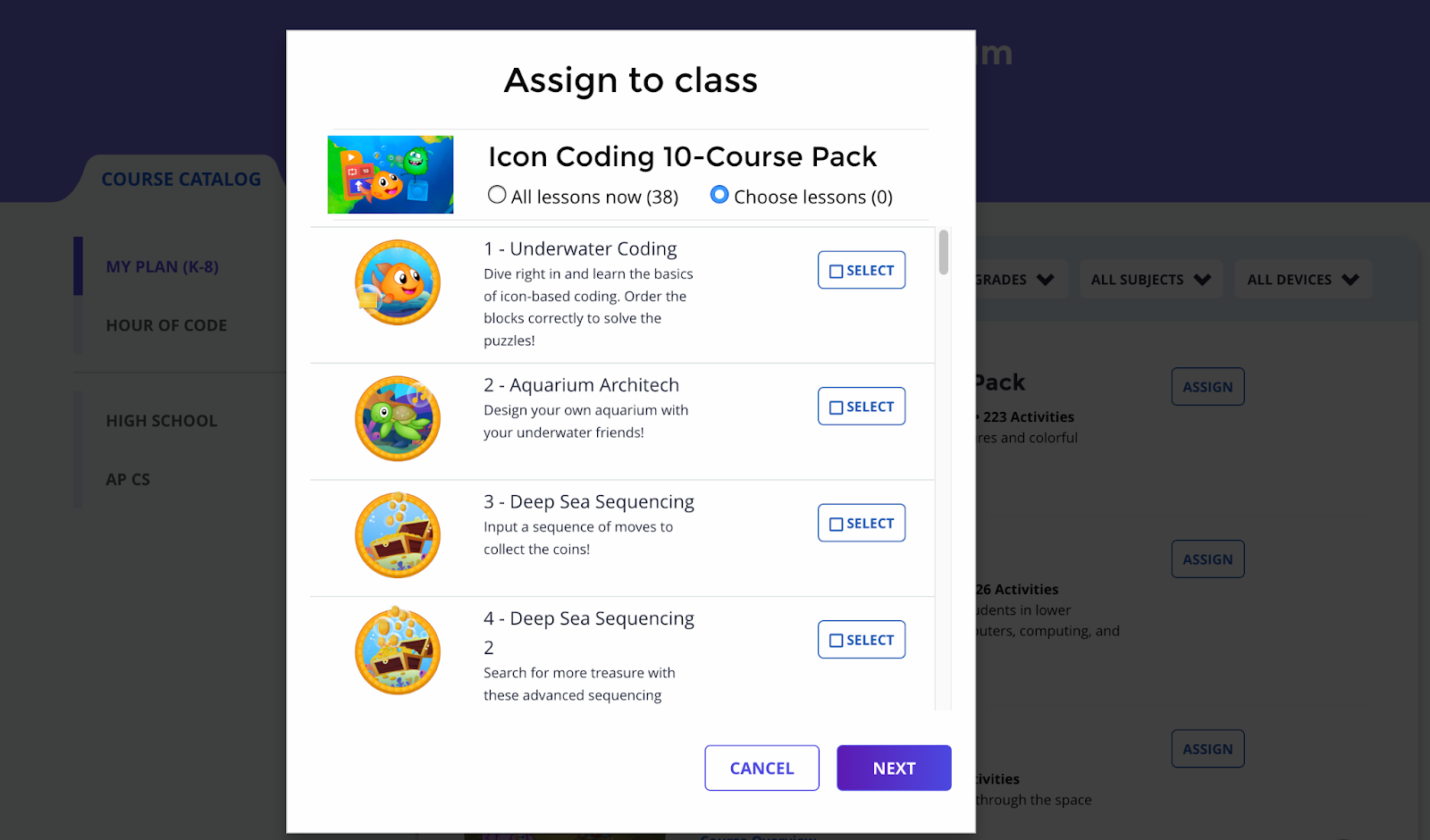 In the window that appears, select "Choose lessons" and choose the lessons you want to assign.