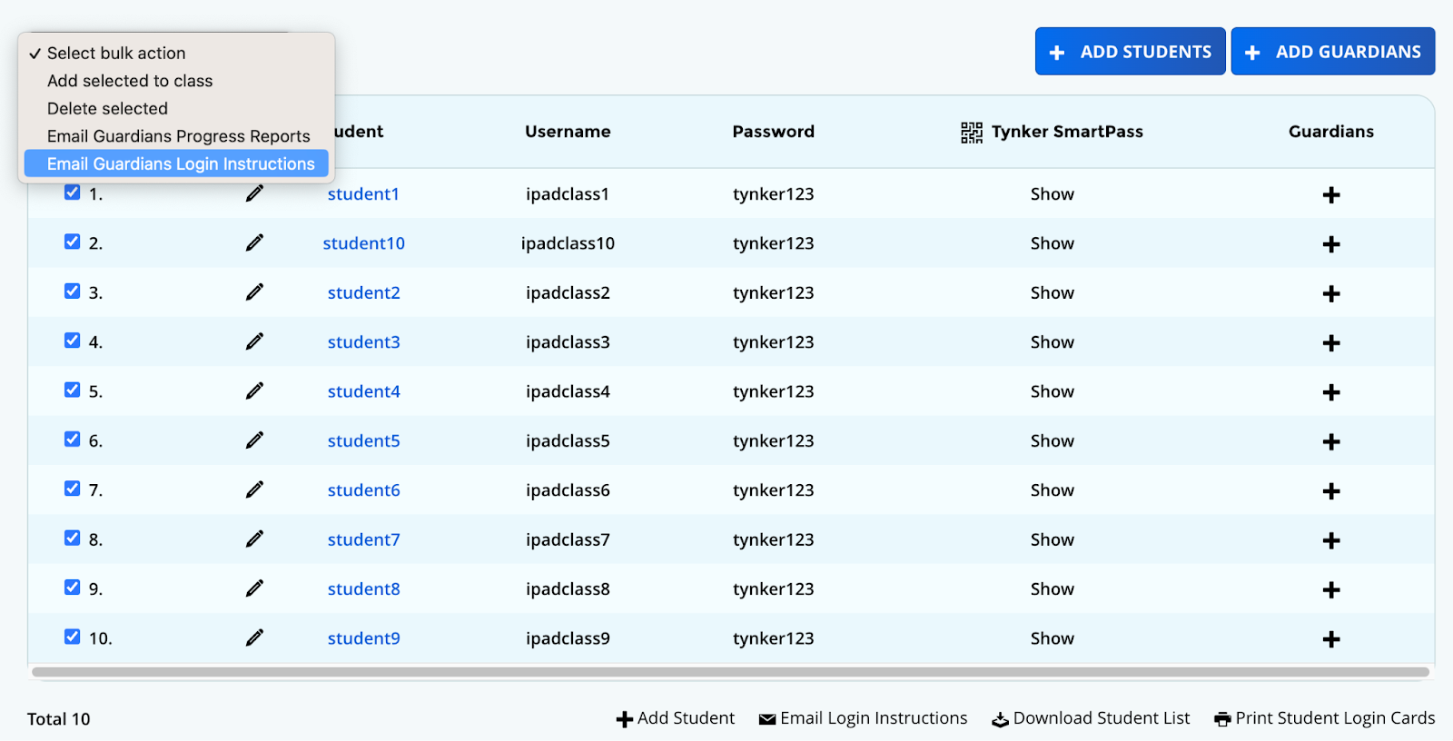 From the bulk action dropdown menu above the student list, select Email Guardians Login Instructions. The Tynker Smart Pass is included.