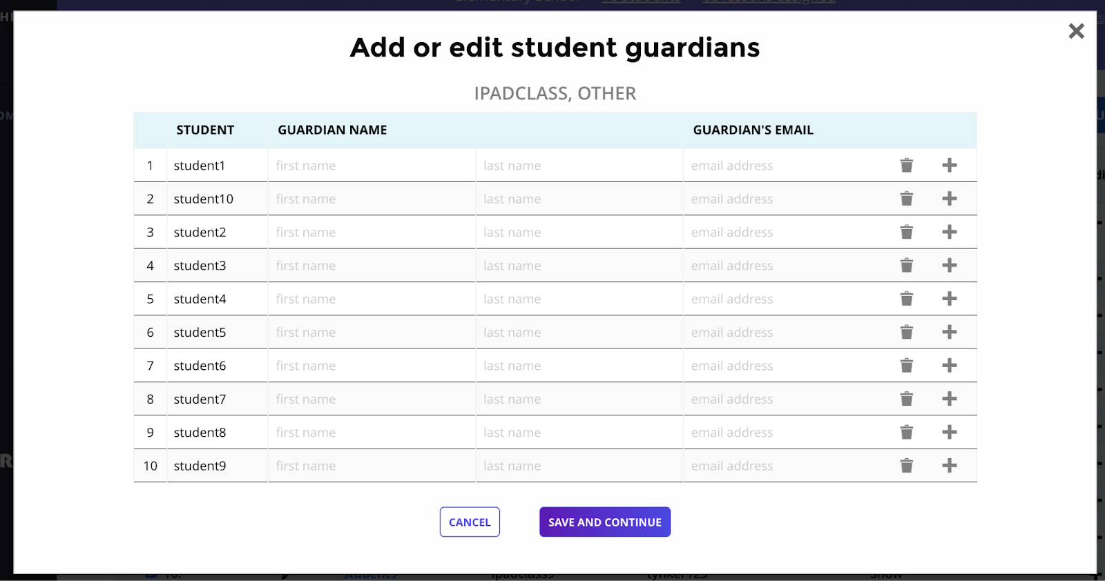 If parent/guardian contact information is not recorded, you will be prompted to enter the names and email addresses for each student's parent/guardian.