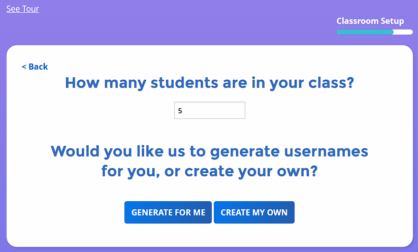 For classrooms not using Clever, ClassLink, Canvas, or Google Classroom, click Set Up Your Classroom or Add Classroom and start by giving the class a grade band, a class name, and click continue.