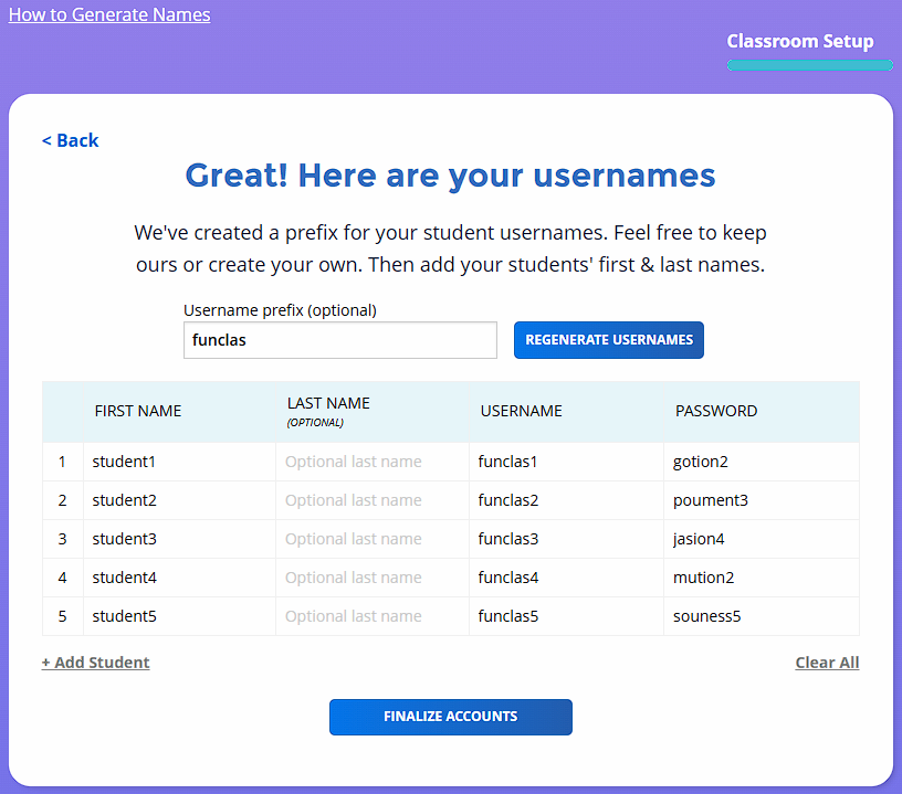 You can change the prefix and regenerate the user names with the box at the top. Update any fields as needed, then click Finalize Accounts.