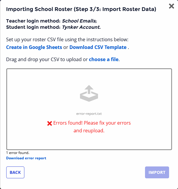 When you’re ready to import your CSV file, Tynker will perform a preflight error check to ensure that your roster file is valid, flagging for common errors such as missing fields and duplicate users. After the check has run, download the error report, fix all the issues, and re-import the CSV file. Repeat this process until there are no more errors. Once you complete the process, click Import to import all your setup data into Tynker.