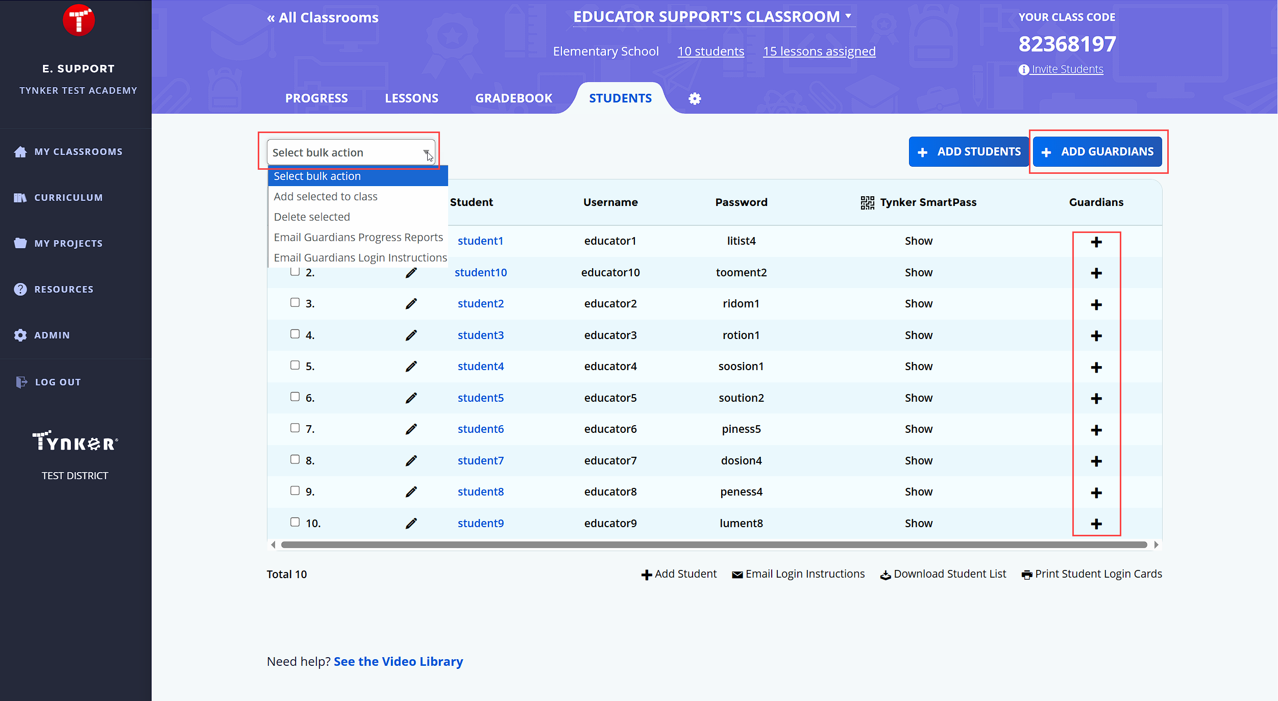 Use the bulk action menu in the top-left to share the login instructions. The Tynker Smart Pass is included.