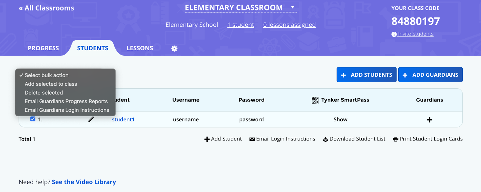 5. Use the bulk action menu to add the selected student to a class.