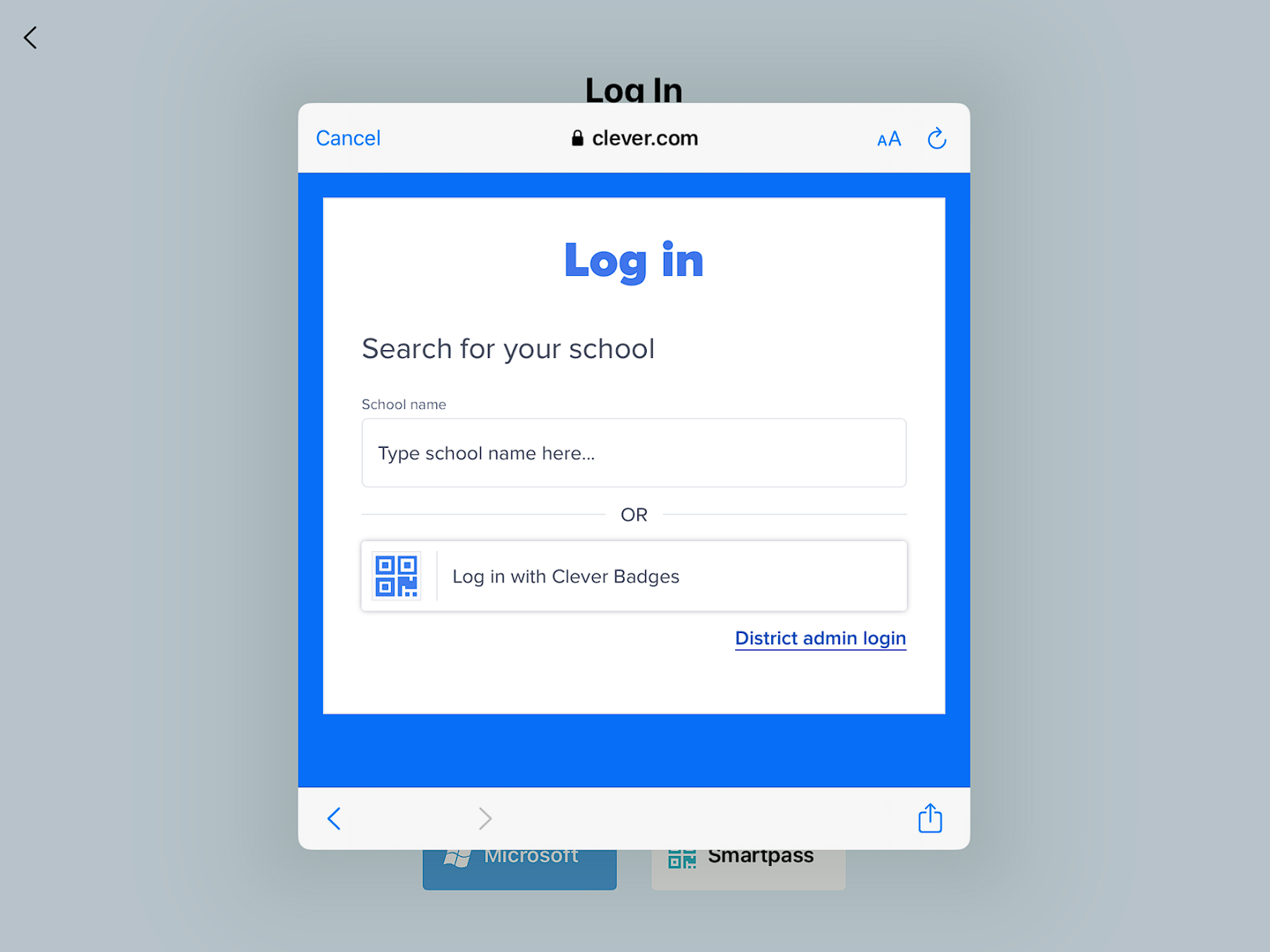 In the Clever login page that appears click Log in with Clever Badges and then scan the student's badge