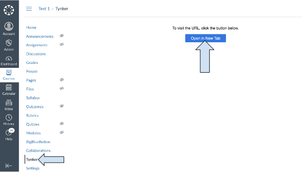 To roster students and enable access through Canvas, the teacher clicks that link and then the open in a New Tab button to log into their Tynker teacher dashboard.